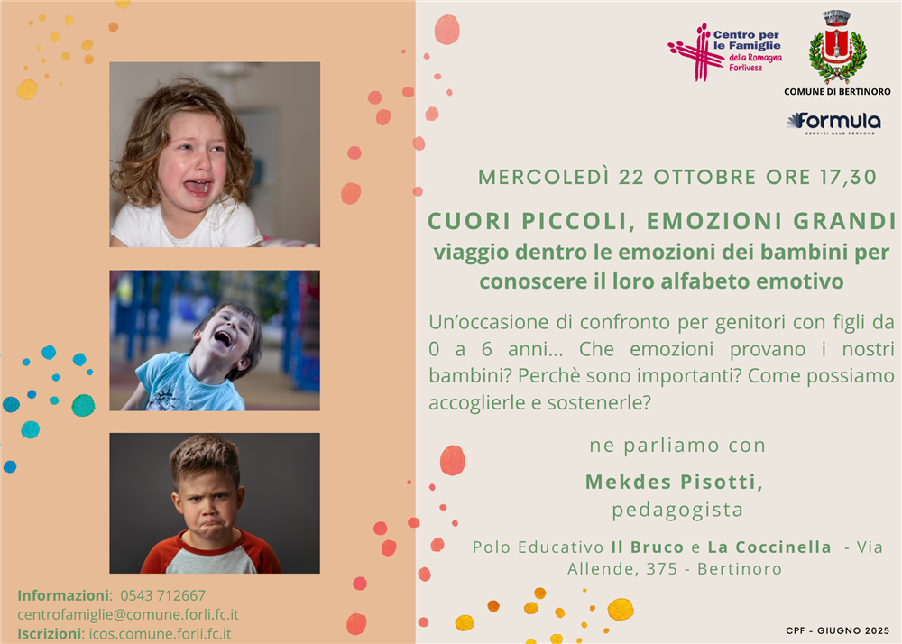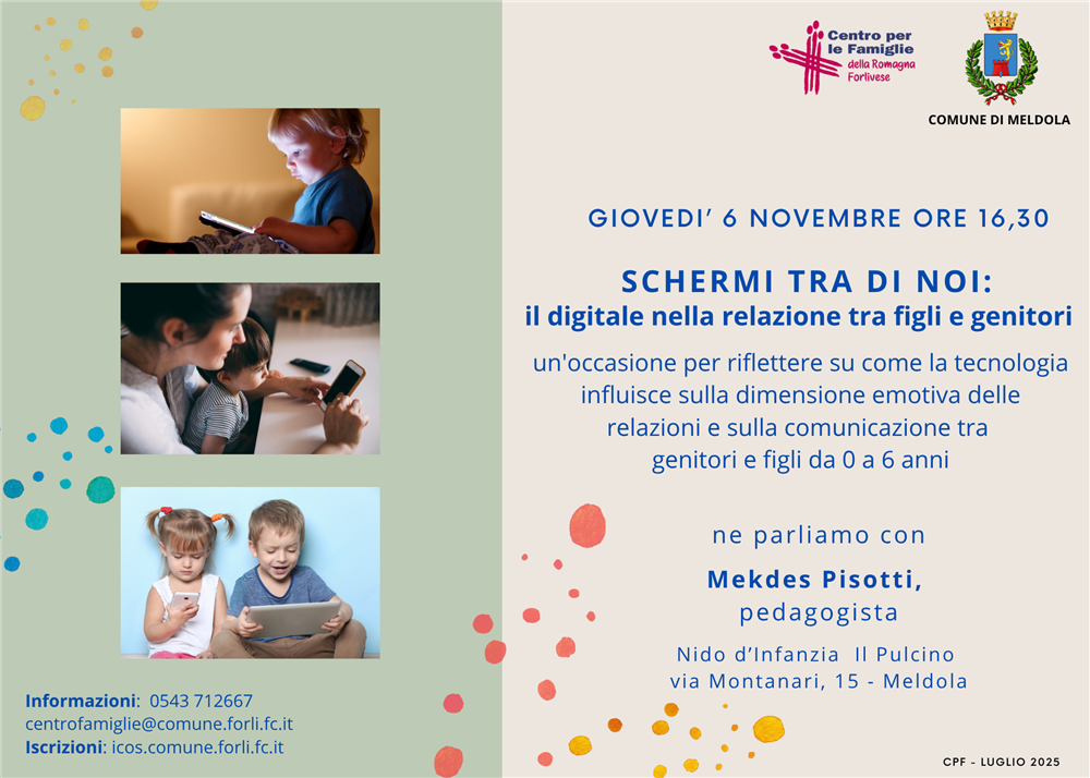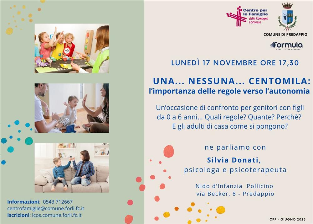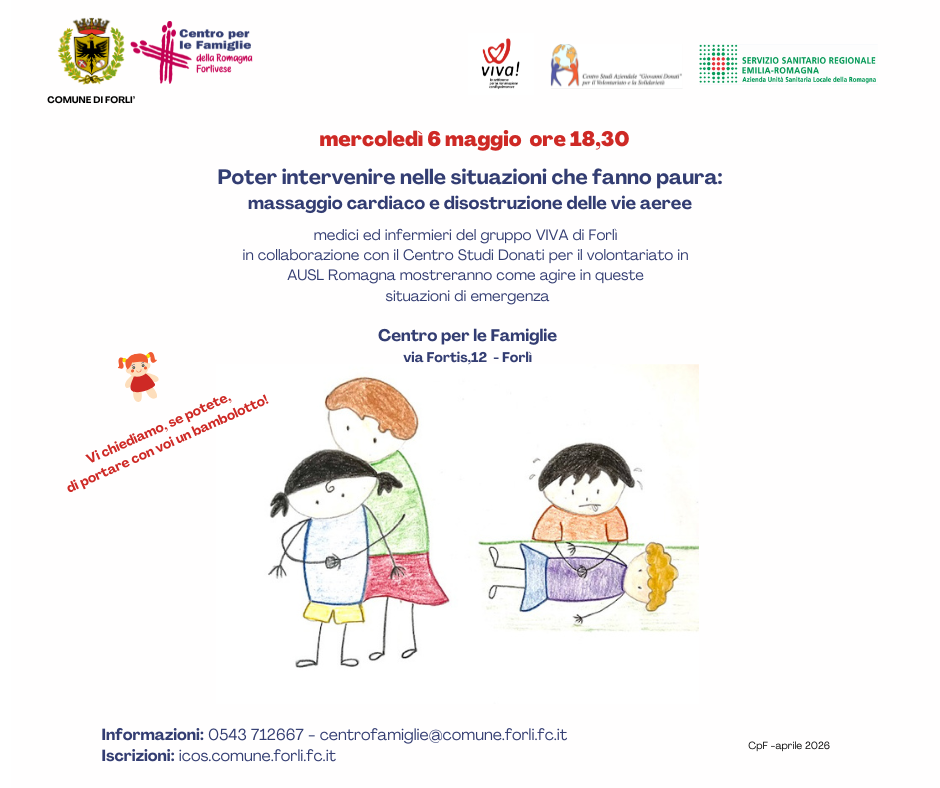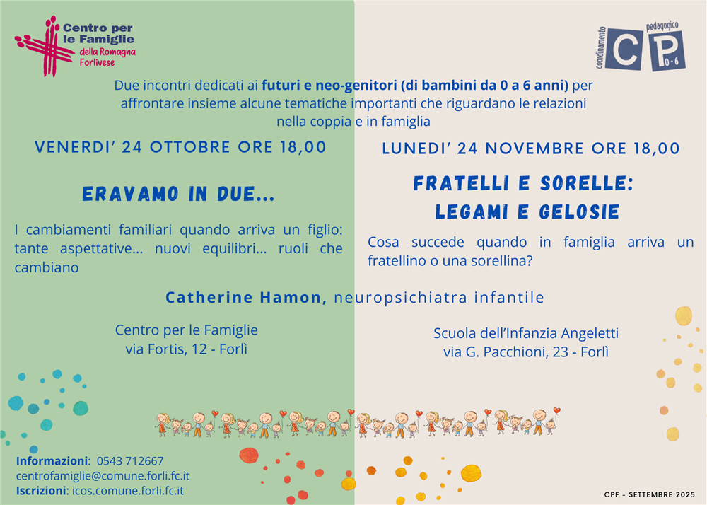 Info: Centro per le Famiglie - orario sportello Informafamiglie&Bambini - lun, mer e ven. 9.00/13.00 - mar e gio 15.00/18.00 - 0543 712667 - centrofamiglie@comune.forli.fc.it