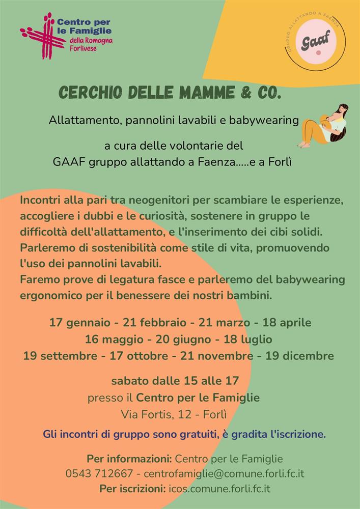 Incontri alla pari tra neogenitori per scambiare le esperienze, accogliere i dubbi e le curiosità, sostenere in gruppo le difficoltà dell’allattamento e l’inserimento dei cibi solidi. Parleremo di sostenibilità come stile di vita promuovendo l’uso dei pannolini lavabili. Faremo prove di legatura delle fasce e scopriremo il babywearing ergonomico per il benessere dei nostri bambini.